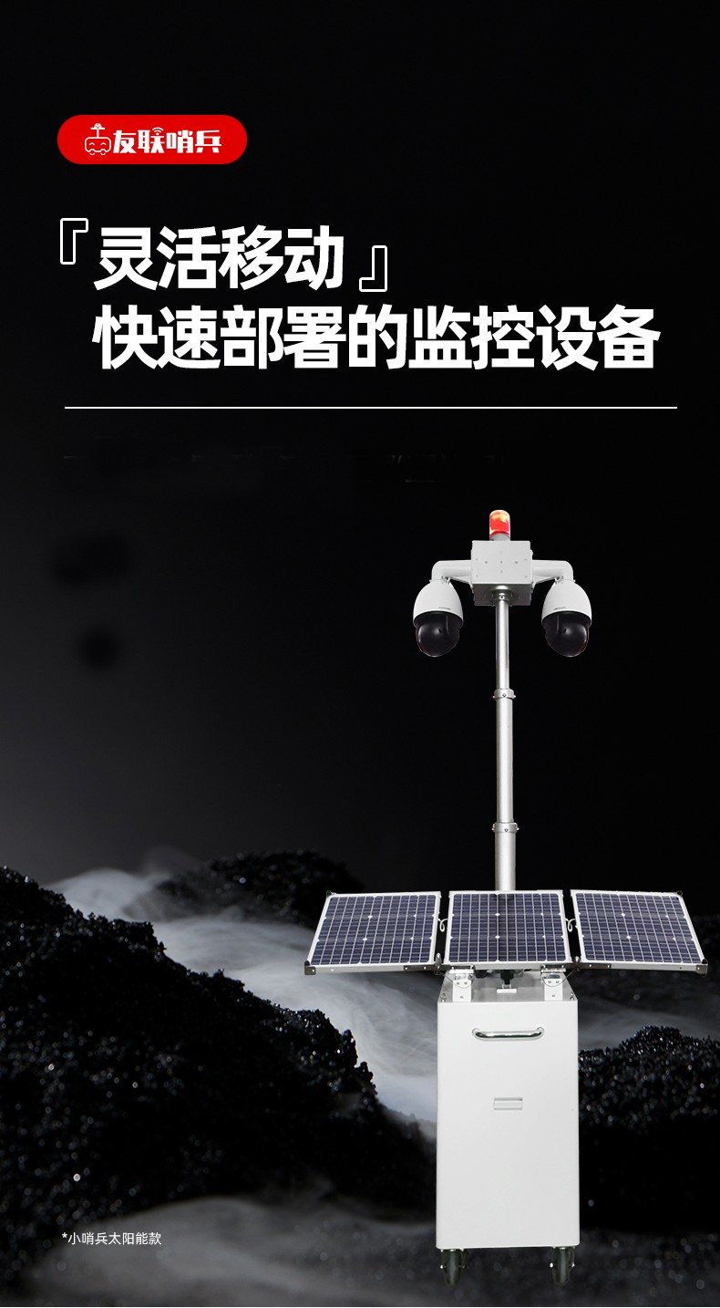 小哨兵移動監(jiān)控系統(tǒng)太陽能電池供電超長續(xù)航便捷監(jiān)控 友聯(lián)哨兵多功能移動兵站(輕便型小哨兵移動監(jiān)控)是一款十分靈活的中小型移動監(jiān)控設備,自帶網(wǎng)電,具備較高的機動性,系統(tǒng)可集高清視頻監(jiān)控、照明、報警、廣播、對講、氣象環(huán)境監(jiān)測、存儲、控制、無線傳輸、一鍵升降等功能于一體,并可具備市電、太陽能等多種能源補給方式,提升續(xù)航時間,以適應各類復雜的環(huán)境。戶外使用,不懼風雨,隨需移動,循環(huán)利用??蓮V泛用于石油管道巡檢、工地監(jiān)控、電力維修監(jiān)控、活動安防、戶外作業(yè)等臨時監(jiān)控或長期監(jiān)控。