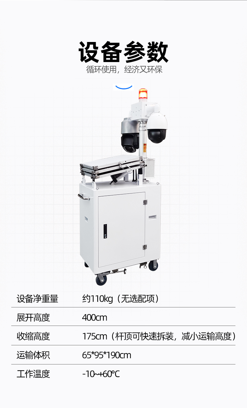 友聯(lián)哨兵多功能移動兵站-輕便型移動監(jiān)控 友聯(lián)哨兵多功能移動兵站(輕便型小哨兵移動監(jiān)控)是一款十分靈活的中小型移動監(jiān)控設備,自帶網(wǎng)電,具備較高的機動性,系統(tǒng)可集高清視頻監(jiān)控、照明、報警、廣播、對講、氣象環(huán)境監(jiān)測、存儲、控制、無線傳輸、一鍵升降等功能于一體,并可具備市電、太陽能等多種能源補給方式,提升續(xù)航時間,以適應各類復雜的環(huán)境。戶外使用,不懼風雨,隨需移動,循環(huán)利用??蓮V泛用于石油管道巡檢、工地監(jiān)控、電力維修監(jiān)控、活動安防、戶外作業(yè)等臨時監(jiān)控或長期監(jiān)控。